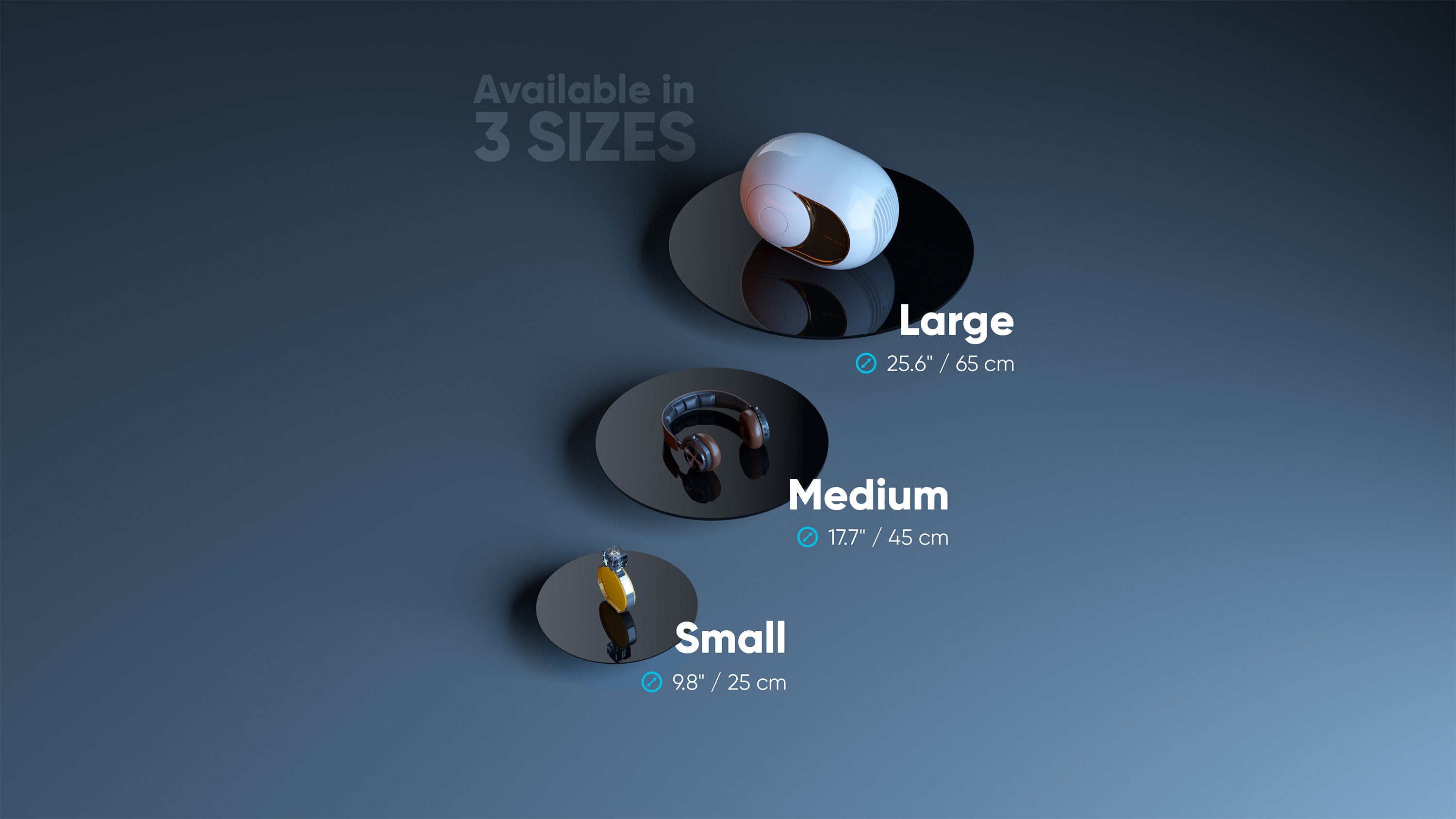 Turntable Module v2 is designed for seamless 360° product showcasing, available in three sizes to suit different needs. The Medium and Large models include a plexiglass stand for added stability.